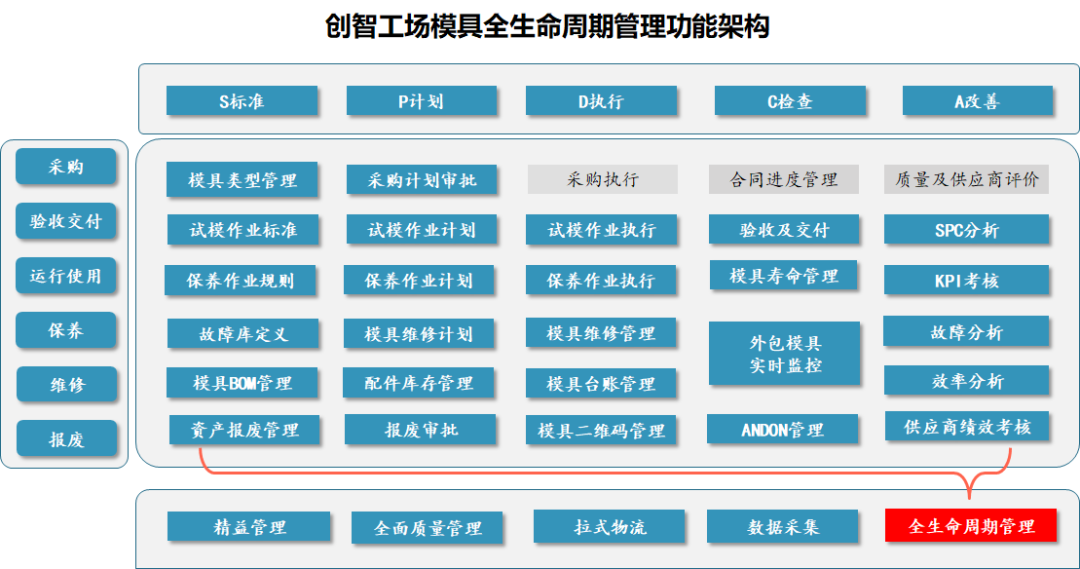 模具,素有"工業(yè)之母"的稱號,模具的全生命周期透明化管理對于智能制造的重要性也就不言而喻了。創(chuàng)智工場,憑借多年數(shù)字化轉型經驗,提供模具的全生命周期管理解決方案,以模具臺賬管理為主線融合從開模、試模、驗收交付、運維、報廢各生命階段的業(yè)務工作。創(chuàng)智模具管理與創(chuàng)智精益生產、創(chuàng)智物流、創(chuàng)智質量、創(chuàng)智設備、創(chuàng)智物聯(lián)穿透打通,全方位實現(xiàn)模具管理的標準化、信息化,同時建立在線監(jiān)控績效看板,為企業(yè)邁向智能制造奠定基礎。